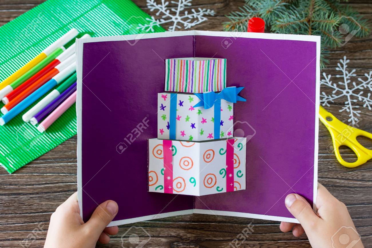 A Child Holds A Birthday Card With Christmas Presents Made By